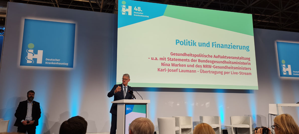 Warken sagt den Repräsentanten der Krankenhäuser Kommunikation zu, „auch dann, wenn man nicht einer Meinung ist.“ Sie lobt den anwesenden Gesundheitsminister Nordrhein-Westfalens („Lieber Karl-Josef“), der mit seiner Krankenhausreform Pionierarbeit geleistet habe.